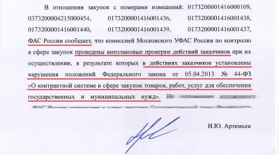 «В отношении закупок с номерами извещений: 0173200001416000109, 0373200004215000454, 0173200001416001436, 0173200001416001438, 0173200001416001440, 0173200001416001439, 0173200001416001437, ФАС России сообщает, что комиссией Московского УФАС России по контролю в сфере закупок проведены внеплановые проверки действий заказчиков при их осуществлении, в результате которых в действиях заказчиков установлены нарушения положений Федерального закона от 05.04.2013 №44-ФЗ «О контрактной системе в сфере закупок товаров, работ, услуг для обеспечения государственных и муниципальных нужд», - сообщается в ответе руководителя ФАС Игоря Артемьева на запрос КПРФ.