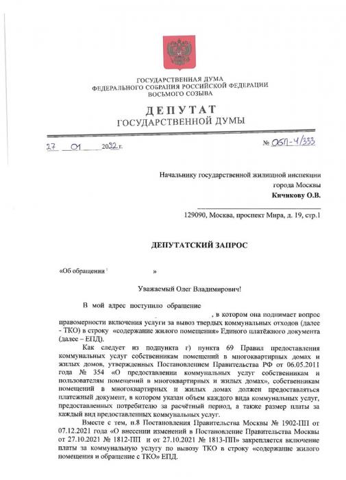 Депутат Государственной Думы С.П. Обухов направил запрос В.Ю. Торсунову, в котором поднял вопрос о необходимости оплаты задолженностей за отопление перед ресурсоснабжающими компаниями за счет средств, ранее сэкономленных управляющими компаниями, а не за счет новых поборов жителей.