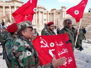 Во время штурма Пальмиры в передовые части сирийской армии передали красные знамена с советским гербом, сделанные наподобие знамени Победы, водруженного над Рейхстагом в 1945 году.