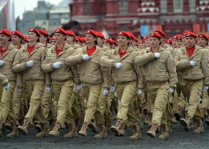 10. Колонна "Юнармии" (это нечто типа советского ДОСААФ, видимо?) - что-то новое. В песочной форме и красных беретах.