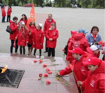 Продолжился праздник на Соколовой горе. Пионеры возложили цветы к Вечному огню, поднялись к монументу «Журавли» и совершили экскурсию по парку Победы, где ознакомились с советской военной техникой.