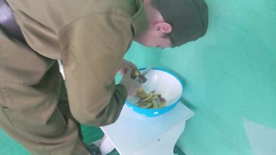 Мальчики творчески подошли к созданию девиза и представлению команды. А девочки нарисовали тематические плакаты болельщиков. Команды проходили полосу препятствий, наматывали портянки, ели кашу, чистили картошку