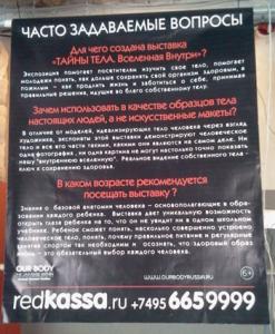 В Москве, в двух шагах от Кремля открылась (и закрываться не собирается) выставка под названием «Тайны тела», где в виде экспонатов заявлены «реальные человеческие тела».