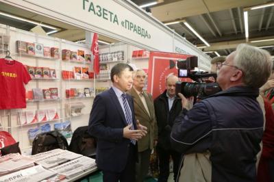 Знакомство с выставкой Дмитрий Георгиевич начал с посещения павильона газеты «Правды». Старейшая газета России представила яркую экспозицию. На ней можно найти не только газетные номера — как современные, так и исторические, — но и большой выбор общественно-политической литературы, которая издаётся при активном участии самой редакции и Центрального комитета КПРФ. Среди книг — работы правдинских публицистов и издания, посвящённые юбилейным датам. Самое свежее издание посвящено 80-летию со дня рождения первого космонавта планеты Ю.А. Гагарина.