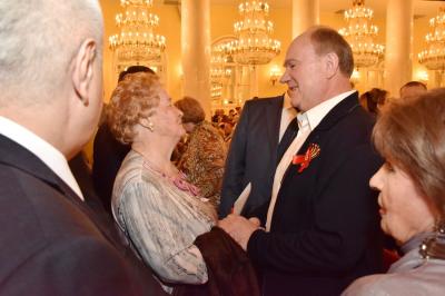 «Сейчас на эту сцену поднимется народный артист СССР Иосиф Кобзон. Я хочу от вашего имени поздравить этого замечательного артиста со званием Героя России», - громкими аплодисментами лидер КПРФ и зрители встретили легендарного советского певца Иосифа Кобзона, который в свою очередь поблагодарил КПРФ и Геннадия Андреевича за ту помощь и поддержку, которую оказывает наша партия Донбассу, в том числе детям этой республики.Он выразил пожелание, чтобы наши народы жили в мире и согласии.