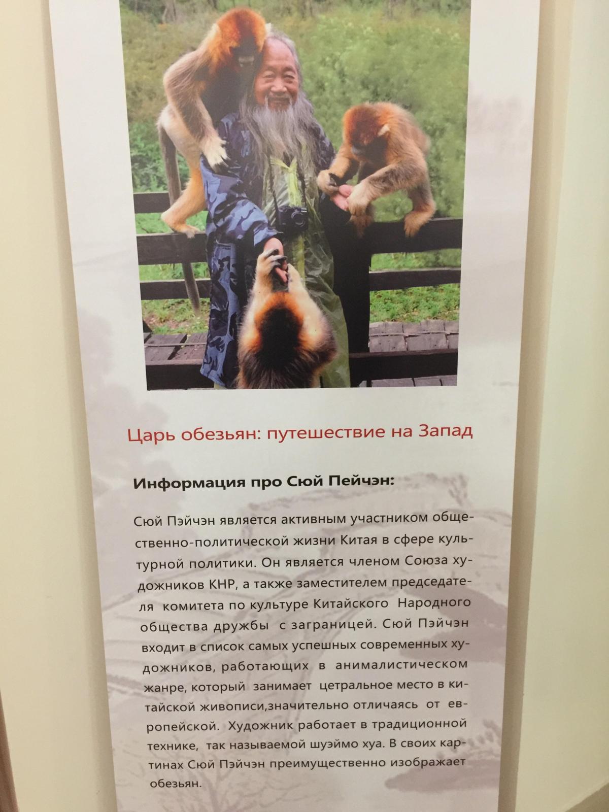 Выставка «Царь обезьян: путешествие на Запад» включает в себя более восьмидесяти полотен, раскрывающих богатство китайского культурного наследия, связывая собой культуры, народы и поколения наших стран. В Китайской культуре обезьяна считается символом мудрости и хитрости. Экспозиция уже была представлена в Нью-Йорке, Париже и Токио, и вот теперь она - в столице нашей Родины.