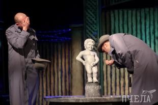 На сцене перед зрителями забор из досок с колючей проволокой (символ тирании), фонтан с фигурой писающего мальчика и монумент девушки с веслом – бездарная эклектика, непонятная, а, значит, ого, «талантливая».