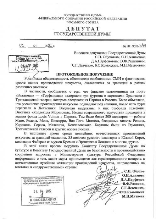 В этой связи просим поручить Комитету Государственной Думы по культуре и Комитету Государственной Думы по безопасности и противодействию коррупции запросить в Министерстве культуры Российской Федерации информацию о том, какие меры принимаются для гарантированного возврата в отечественные музейные коллекции произведений искусства, направленных на выставки в «недружественные» страны.