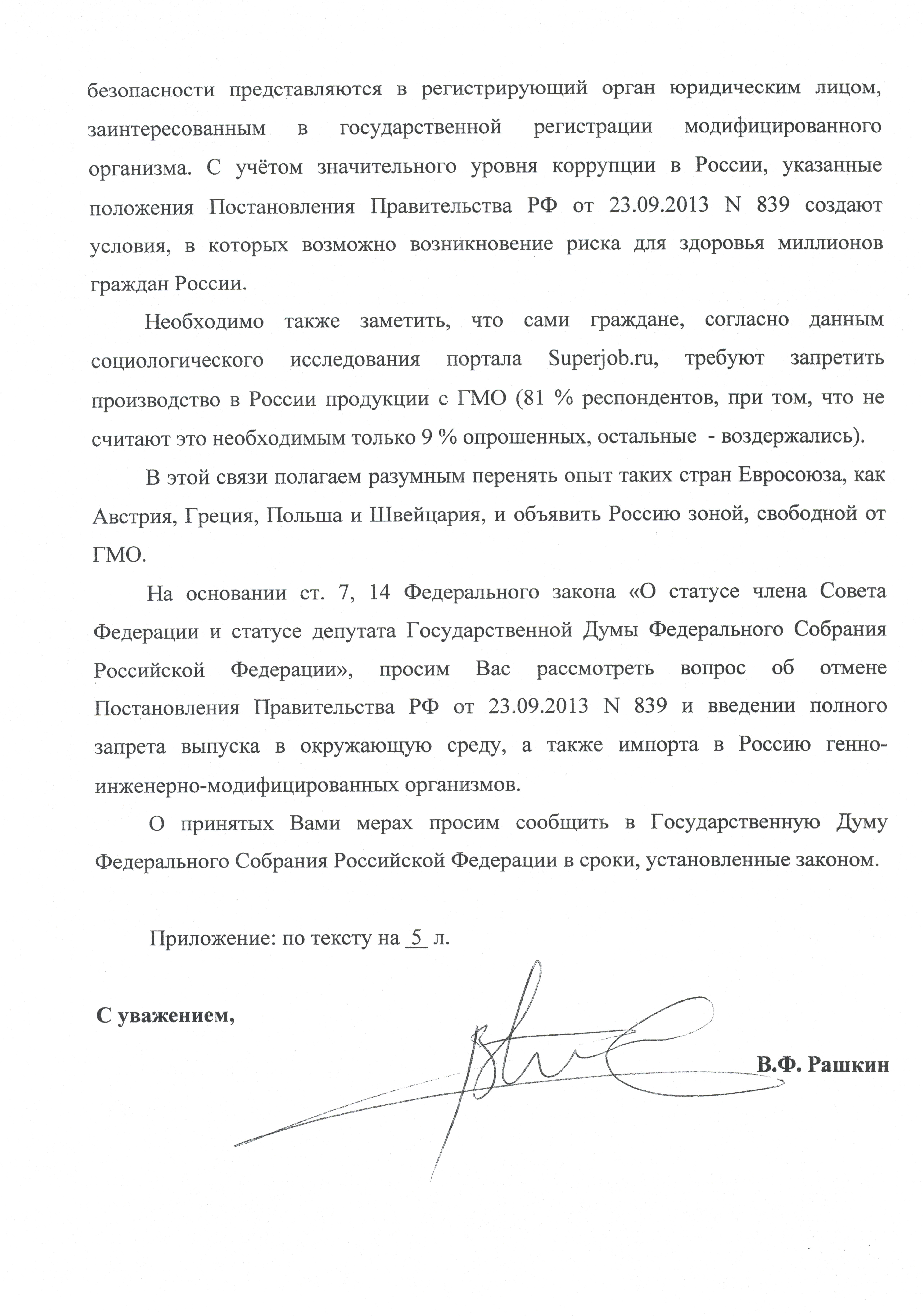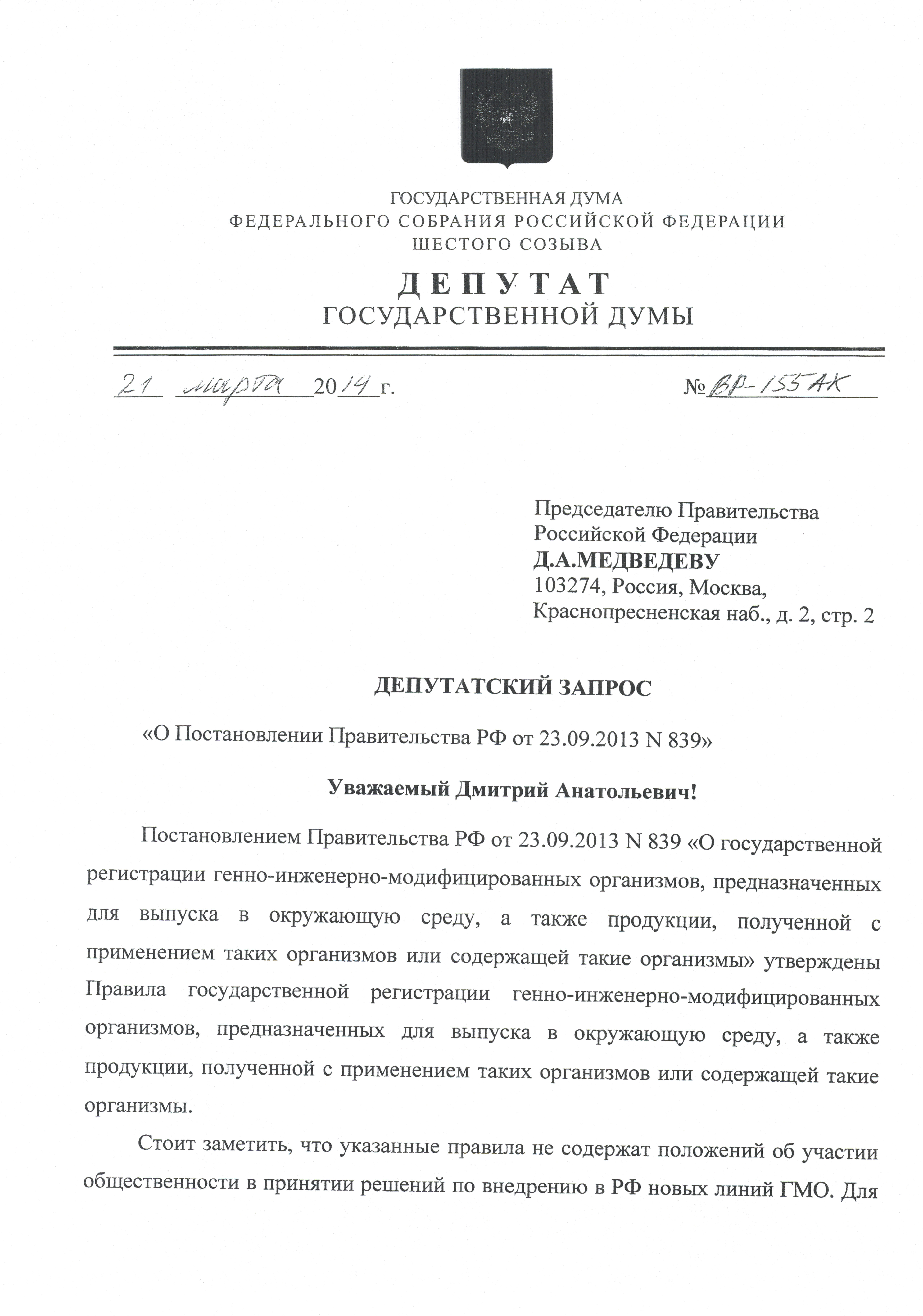 На основании ст. 7, 14 Федерального закона «О статусе члена Совета Федерации и статусе депутата Государственной Думы Федерального Собрания Российской Федерации», просим Вас рассмотреть вопрос об отмене Постановления Правительства РФ от 23.09.2013 N 839 и введении полного запрета выпуска в окружающую среду, а также импорта в Россию генно-инженерно-модифицированных организмов.