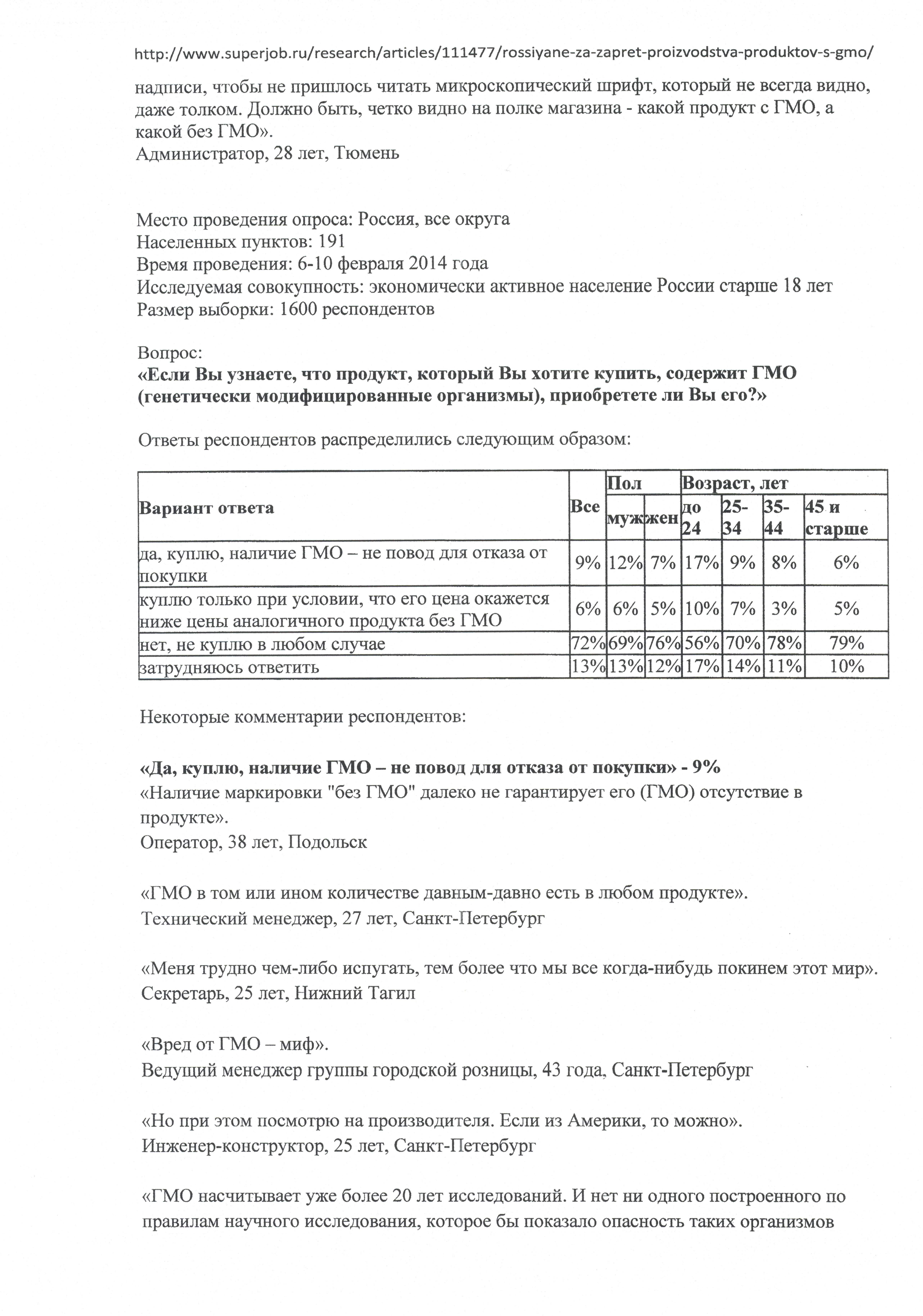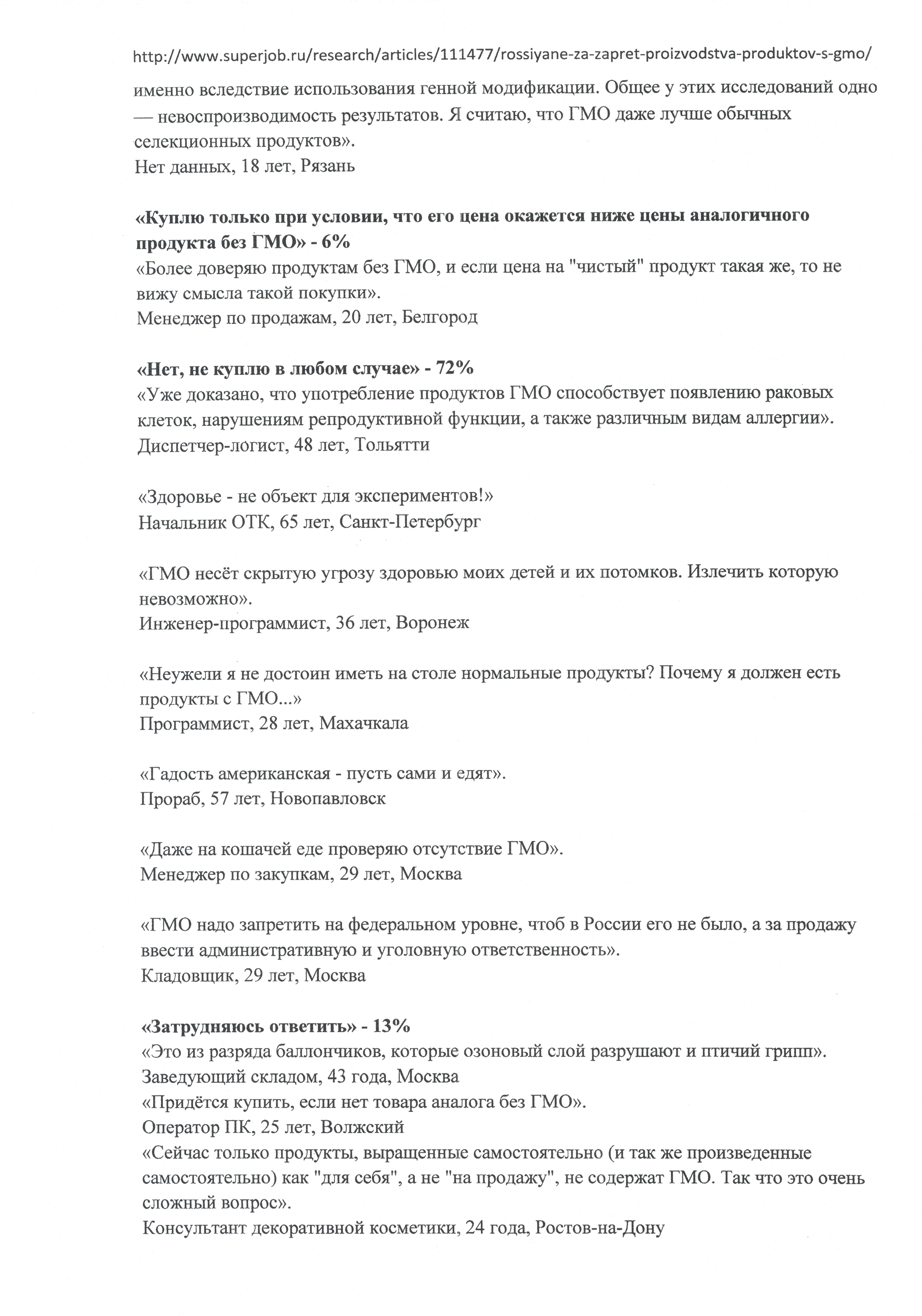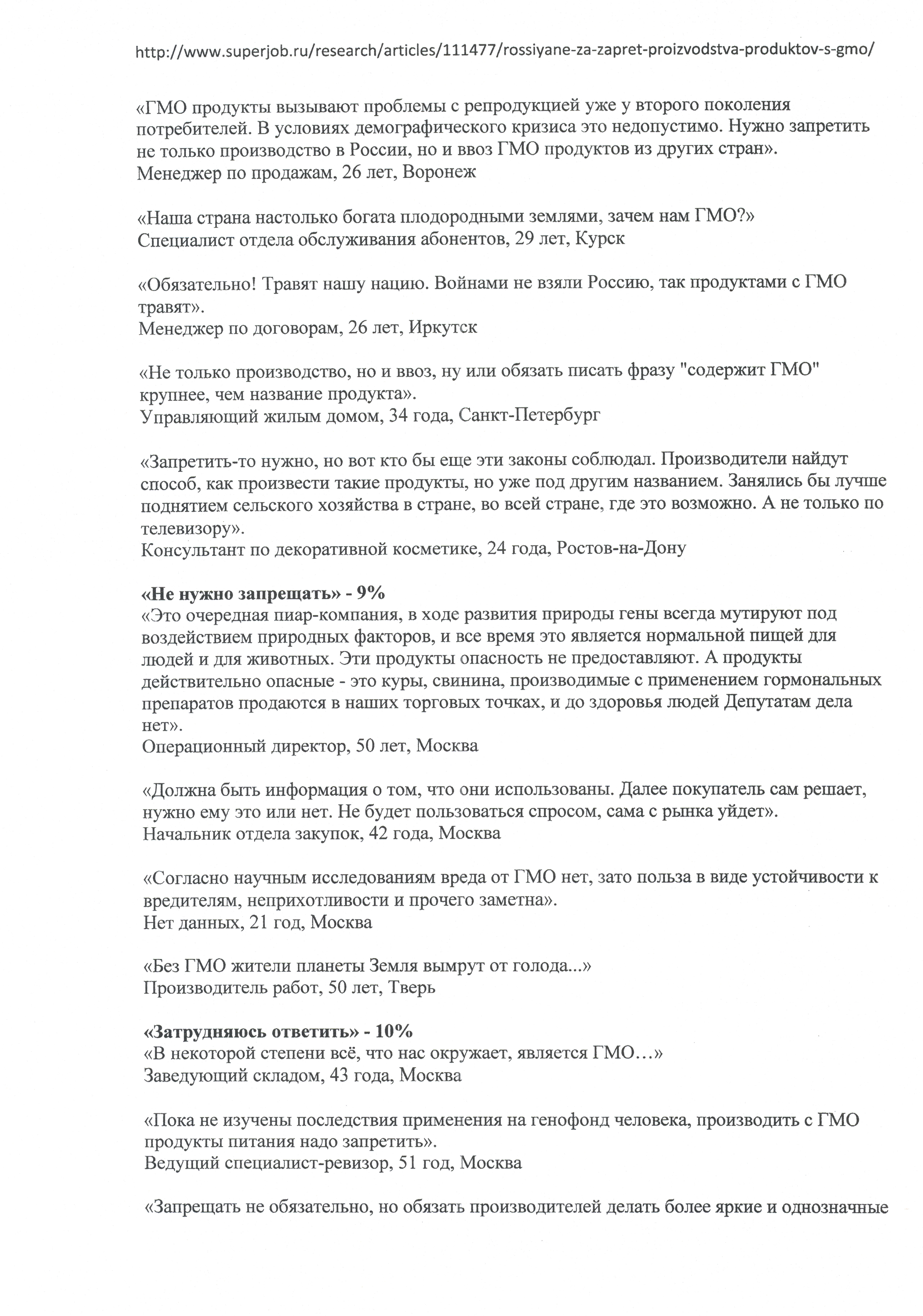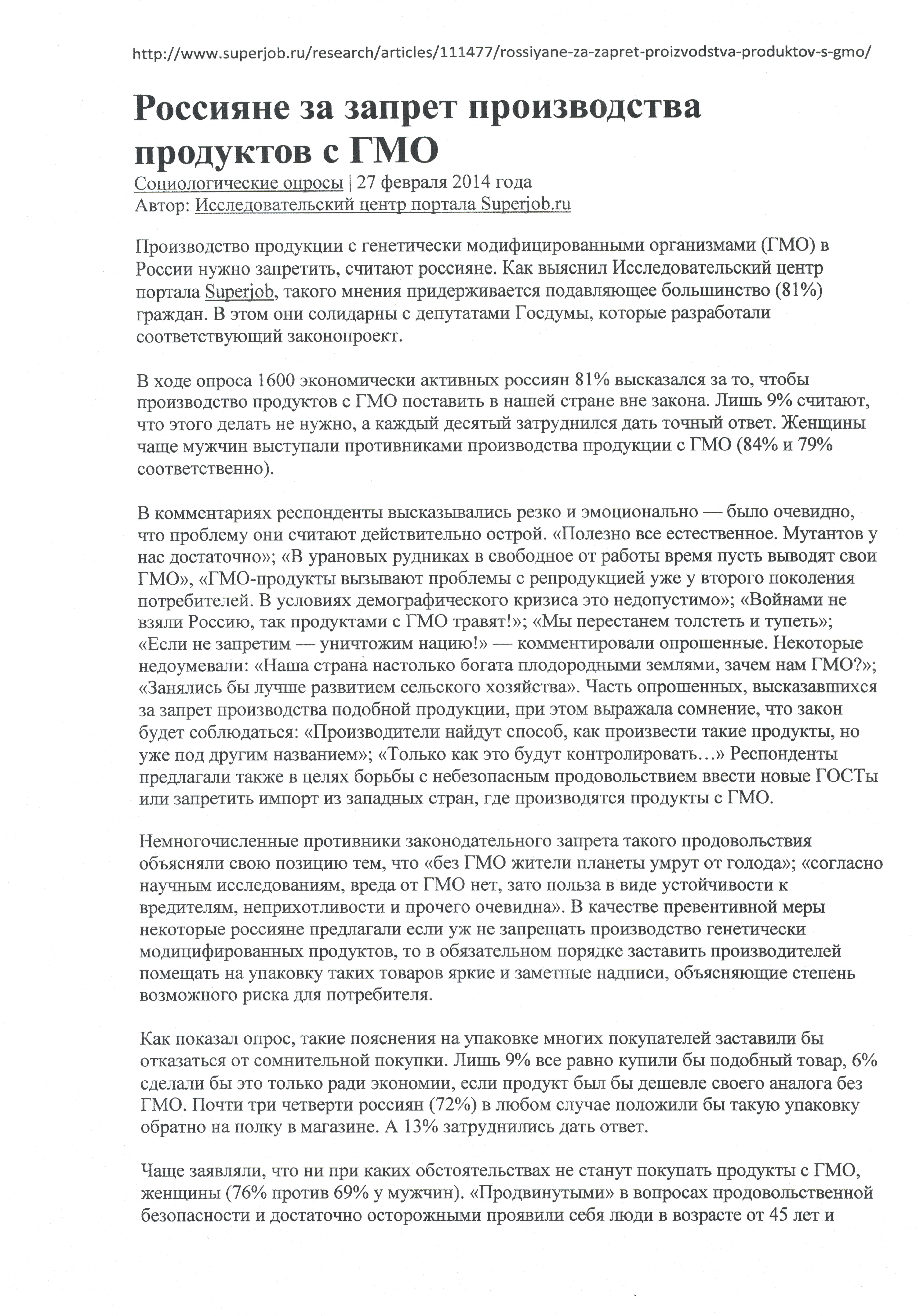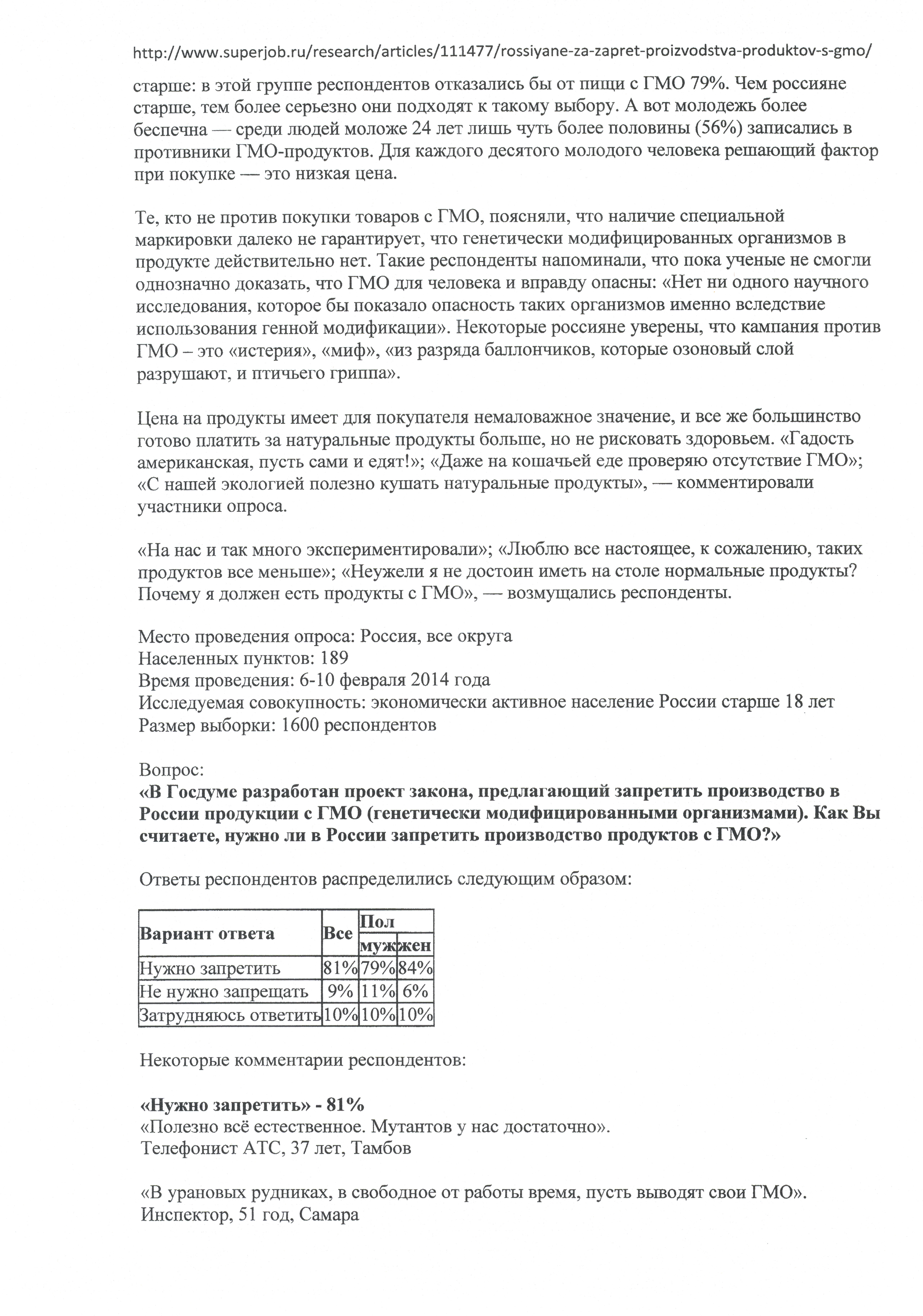 Необходимо также заметить, что сами граждане, согласно данным социологического исследования портала Superjob.ru, требуют запретить производство в России продукции с ГМО (81 % респондентов, при том, что не считают это необходимым только 9 % опрошенных, остальные - воздержались).
