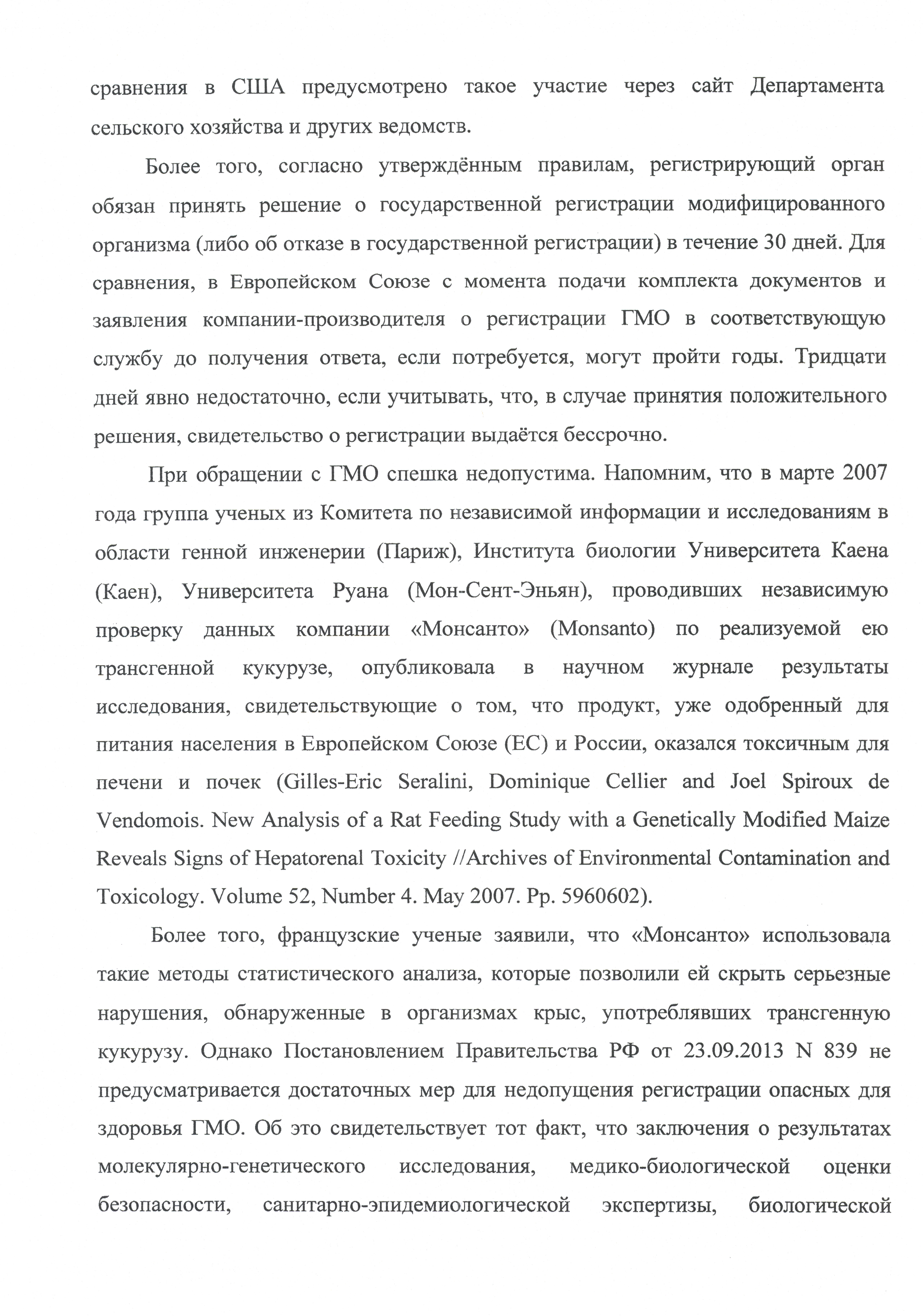 Более того, французские ученые заявили, что «Монсанто» использовала такие методы статистического анализа, которые позволили ей скрыть серьезные нарушения, обнаруженные в организмах крыс, употреблявших трансгенную кукурузу. Однако Постановлением Правительства РФ от 23.09.2013 N 839 не предусматривается достаточных мер для недопущения регистрации опасных для здоровья ГМО. Об это свидетельствует тот факт, что заключения о результатах молекулярно-генетического исследования, медико-биологической оценки безопасности, санитарно-эпидемиологической экспертизы, биологической безопасности представляются в регистрирующий орган юридическим лицом, заинтересованным в государственной регистрации модифицированного организма. С учётом значительного уровня коррупции в России, указанные положения Постановления Правительства РФ от 23.09.2013 N 839 создают условия, в которых возможно возникновение риска для здоровья миллионов граждан России.