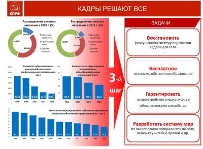 В этой связи КПРФ считает необходимым в кратчайшие сроки восстановить разрушенную систему подготовки кадров для села, осуществлять обучение специалистов полностью за счёт средств бюджета одновременно обеспечив их гарантированными рабочими местами. Немаловажной задачей при этом является разработка системы мер по закреплению специалистов на селе, в том числе учителей, врачей и другой сельской интеллигенции.