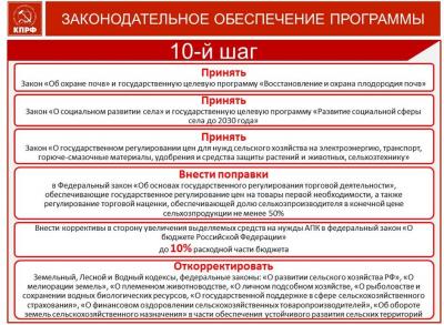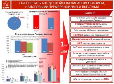Своей политической волей КПРФ создаст все необходимые условия для обеспечения АПК инвестиционными кредитами, предоставит государственную поддержку непосредственно товаропроизводителю без посредников, отменит уплату налога на имущество и земельного налога с их кадастровой стоимости, освободит от налогов на первые 3-5 лет вновь создаваемые сельхозпредприятия в регионах с неразвитым сельским хозяйством.