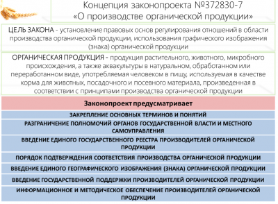 органического производства. Так, к примеру, в законопроекте не учтены принятые