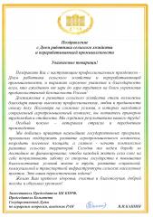 Поздравляю Вас с наступающим профессиональным праздником – Днем работника сельского хозяйства и перерабатывающей промышленности, и выражаю огромное уважение и благодарность всем, кто ежедневно от зари до зари трудится на благо укрепления продовольственной безопасности России!