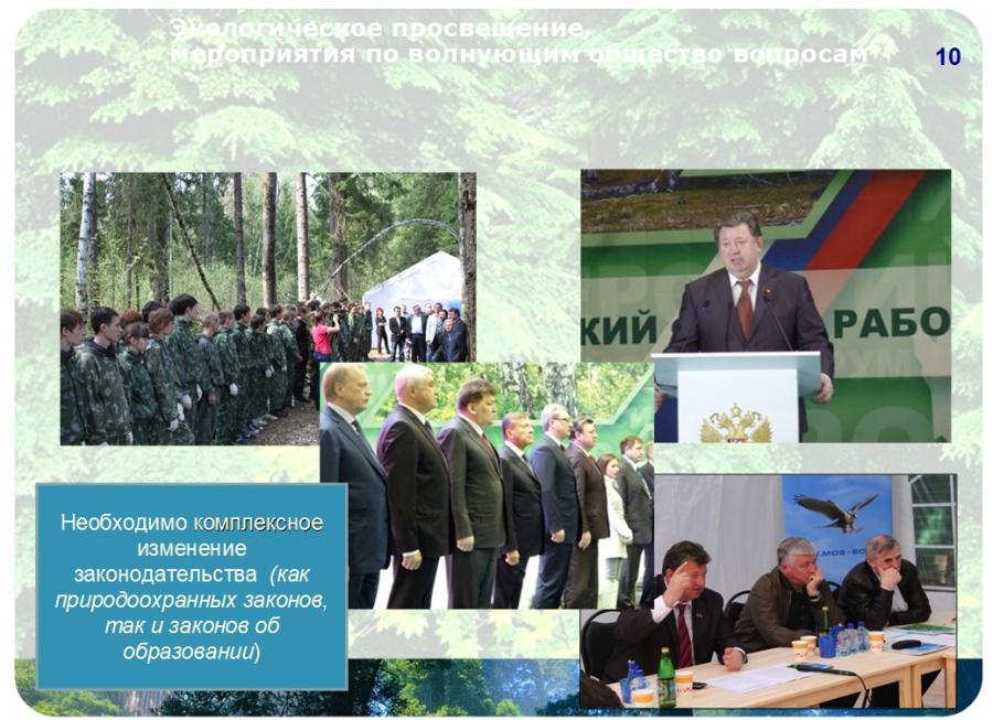 Подведу итог. Предлагаю внести в итоговую резолюцию конгресса предложения об увеличении расходов федерального бюджета на цели охраны окружающей среды до уровня 2 % расходной части федерального бюджета и дополнение Закона об образовании нормой об обязательном включении требования об изучении экологических основ во все федеральные государственные образовательные стандарты.