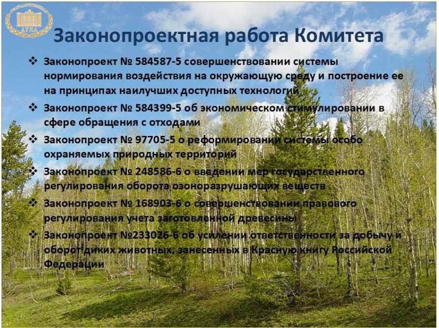 - совершенствование правового регулирования учета заготовленной древесины; о передаче субъектам Российской Федерации полномочий по образованию лесных участков; об осуществлении мероприятий по охране, защите, воспроизводству лесов специализированными учреждениями.