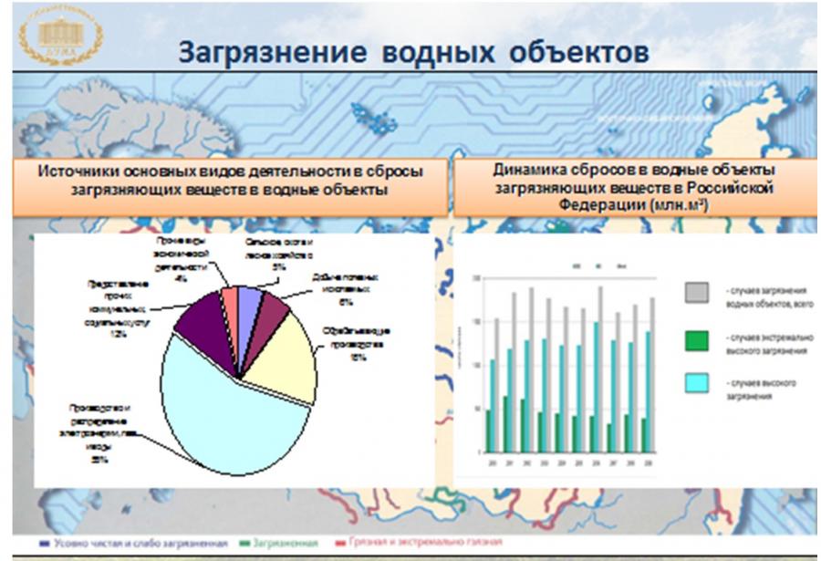 Ежегодно в них сбрасывается до 52 куб. км сточных вод, из которых менее 30% подлежат очистке. Вместе со сточными водами в поверхностные водные объекты Российской Федерации ежегодно поступает около 10 - 11 млн. тонн загрязняющих веществ.