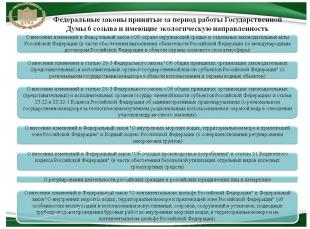 Принят ряд других законов, в том числе «О внесении изменений в закон Российской Федерации «О недрах» (в части определения порядка расчета размера вреда, причиненного недрам вследствие нарушения законодательства Российской Федерации о недрах), «Об аквакультуре (рыбоводстве) и о внесении изменений в отдельные законодательные акты Российской Федерации», «О внесении изменений в Федеральный закон «Об охоте и о сохранении охотничьих ресурсов и о внесении изменений в отдельные законодательные акты Российской Федерация» и Кодекс Российской Федерации об административных правонарушениях (в части совершенствования правового регулирования в области охоты и сохранения охотничьих ресурсов), «О внесении изменений в Федеральный закон «О континентальном шельфе Российской Федерации” и Федеральный закон «О внутренних морских водах, территориальном море и прилежащей зоне Российской Федерации» (об особенностях эксплуатации и использования искусственных островов, сооружений и установок, подводных трубопроводов и проведения буровых работ во внутренних морских водах, в территориальном море и на континентальном шельфе Российской Федерации», «О внесении изменений в Федеральный закон «О внутренних морских водах, территориальном море и прилежащей зоне Российской Федерации» и Водный кодекс Российской Федерации (о совершенствовании регулирования захоронения грунтов)», «О внесении изменений в статью 26-З