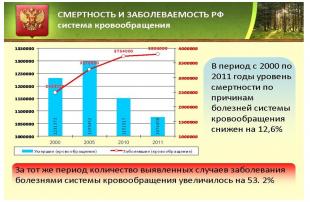 Предлагаю взглянуть на статистику по количеству умерших от болезней системы кровообращения, а также по количеству выявленных заболеваний системы кровообращения. Смертность по названной причине в период с 2000 по 2011 годы снизилась на 12,6%, но заболеваемость выросла больше чем в 1,5 раза (на 53,2%).
