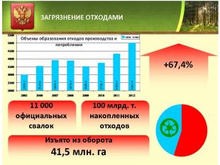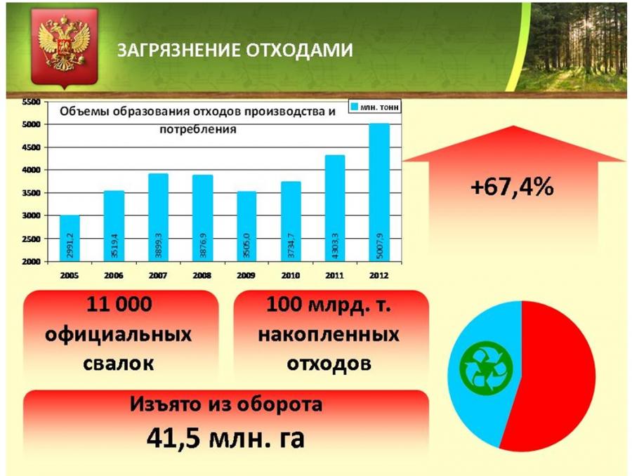 В этой связи нельзя не упомянуть о том, что сегодня в России более 11 тысяч только официальных свалок. В хранилищах и полигонах накоплено почти 100 млрд. тонн отходов. При этом перерабатывается лишь 45% образующихся отходов. В основном это отходы промышленности. Бытовые же отходы практически полностью (93%) размещаются на полигонах.