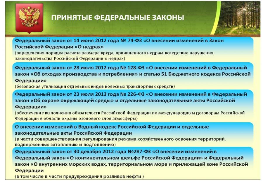 3. Федеральный закон от 23 июля 2013 года № 226-ФЗ «О внесении изменений в Федеральный закон «Об охране окружающей среды» и отдельные законодательные акты Российской Федерации».