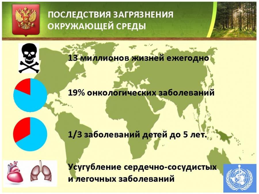 Так, 19% всех онкологических заболеваний, 1/3 всех заболеваний детей в возрасте до 5 лет, усугубление сердечно-сосудистых и легочных заболеваний – лишь начало длинного списка последствий, в том числе, загрязнения окружающей среды. При этом нельзя не учитывать того, что бóльшая часть негативных свойств изменяющейся вследствие антропогенного воздействия окружающей среды еще не изучена.