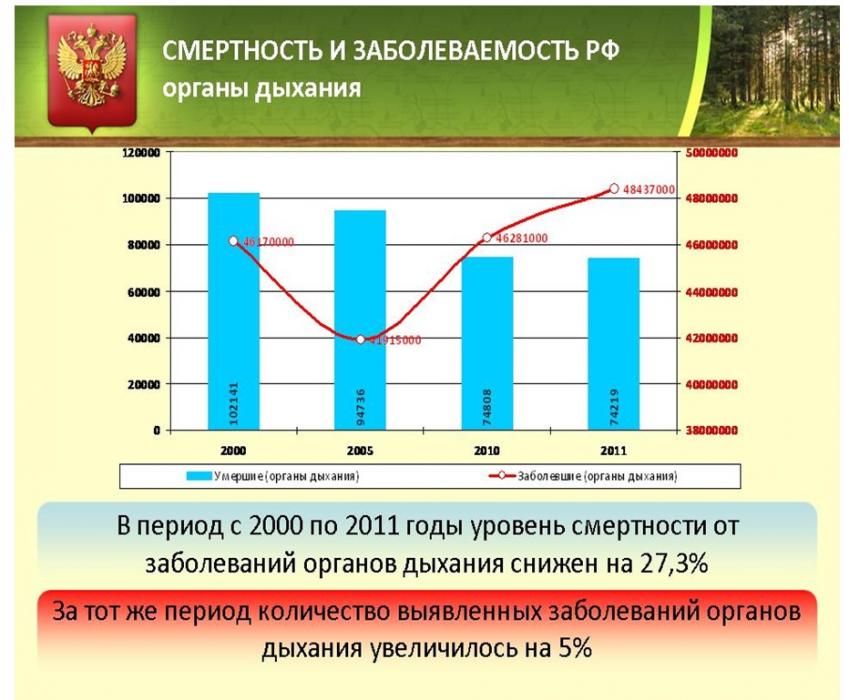 Теперь цифры по количеству умерших от заболеваний органов дыхания и по количеству выявленных заболеваний. Смертность снизилась на 27,3%, но заболеваемость увеличилась на 5%.