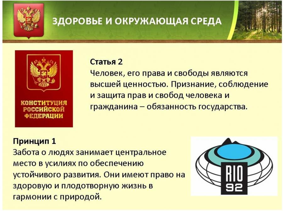 Конституция Российской Федерации провозглашает высшей ценностью человека, его права и свободы. Обеспечение благоприятных условий проживания человека, а именно возможность дышать чистым воздухом, пить чистую воду, иметь доступ к образованию, медицинскому обслуживанию, достойному труду – основная цель деятельности большинства стран мира.