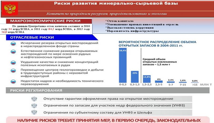 Истощение накопленного за десятилетия поискового задела – участков недр, готовых для предоставления в пользование инвесторам связано с недофинансированием государством геологоразведочных работ начальных стадий, которое, начиная с 2008 г., составило около 40 млрд. руб.