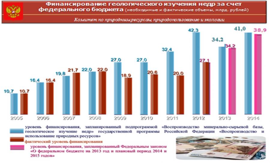 В соответствии с подпрограммой «Воспроизводство минерально-сырьевой базы, геологическое изучение недр» государственной программы Российской Федерации «Воспроизводство и использование природных ресурсов» объем бюджетных ассигнований на реализацию мероприятий составляет на 2014 год и 2015 год 41 млрд. руб. ежегодно, на 2016 год 42,2 млрд. руб.
