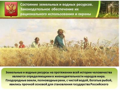 Земельные, водные, а также лесные ресурсы на протяжении всей истории человечества являются определяющими в жизнедеятельности народов мира. Плодородные земли, полноводные реки, с чистой водой, богатые рыбой, лесные богатства явились прочной основой для становления государства Российского. Матушка Земля и Царица Вода на протяжении веков стояли на страже независимости и самобытности русского человека, действительно ценились и даже обожествлялись.