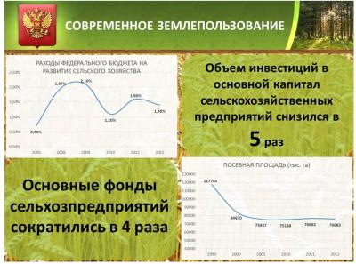 Объем инвестиций в основной капитал сельскохозяйственных предприятий снизился в 5 раз, уровень государственной поддержки агропромышленного комплекса с 1990 года в среднем упал в 10 раз - до 1,48% расходов федерального бюджета, основные фонды сельхозпредприятий сократились в 4 раза, посевные площади уменьшились на 41,5 млн. га (46%).