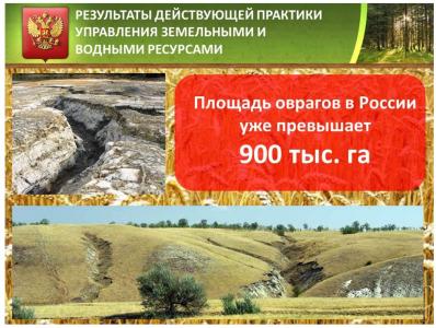 Нарастают темпы оврагообразования. Площадь оврагов в России уже превышает 900 тыс. га. По экспертным оценкам наиболее активные эрозионные процессы наблюдаются в Приволжском, Южном и Центральном федеральных округах, дефляция – в Сибирском и Южном федеральном округе, засоление – в Южном и Сибирском федеральном округе.