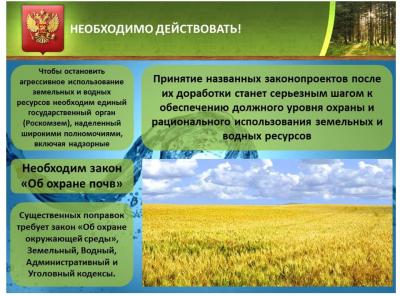 Необходим закон «Об охране почв», который, кстати, в настоящее время разрабатывается Министерством природных ресурсов и экологии Российской Федерации и профильным Комитетом.