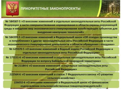Нельзя также обойти стороной вопрос сохранения экосистемы озера Байкал. С целью улучшения ситуации в этой сфере большой круг вопросов решается проектом федерального закона № 175151-6 «О внесении изменений в отдельные законодательные акты Российской Федерации по вопросу Байкальской природной территории».