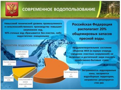 Не смотря на то, что Россия обладает уникальным водно-ресурсным потенциалом (20% общемировых запасов пресной воды) и является глобальным донором водных ресурсов, в связи со сложившейся практикой водопользования, это природное богатство может быть истощено или безвозвратно утрачено.