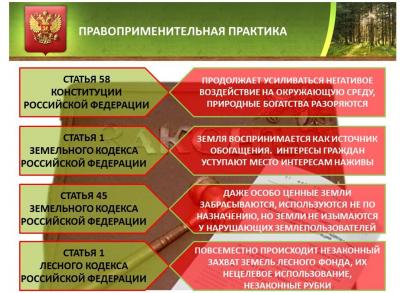 Тем не менее, повсеместно практикуется хищнический подход к природопользованию, земля воспринимается многими собственниками исключительно как источник наживы, повсеместно происходит захват земель лесного фонда, их нецелевое использование, незаконные рубки лесных насаждений.
