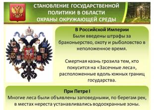 В Российской Империи были введены штрафы за браконьерство, охоту и рыболовство в неположенное время. Смертная казнь грозила тем, кто покусится на так называемые «засечные леса», расположенные вдоль южных границ государства. При Петре I многие леса были объявлены заповедными, по берегам рек, в местах нереста устанавливались водоохранные зоны.