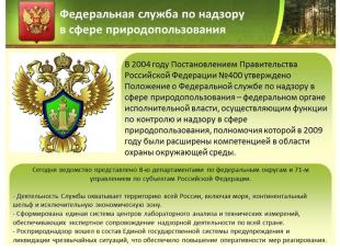 В итоге, в 2004 году Постановлением Правительства Российской Федерации утверждено Положение о Федеральной службе по надзору в сфере природопользования – федеральном органе исполнительной власти, осуществляющим функции по контролю и надзору в сфере природопользования, полномочия которой в 2009 году были расширены компетенцией в области охраны окружающей среды.