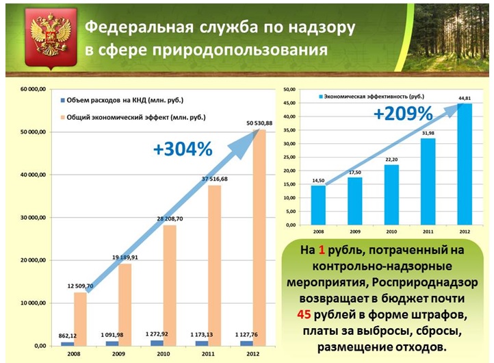 Наблюдается стабильное повышение экономической эффективности контрольно-надзорной деятельности. Только в 2012 году Служба принесла в доход консолидированного бюджета Российской Федерации около 32 млн. рублей. На 1 рубль, потраченный на контрольно-надзорные мероприятия, Росприроднадзор возвращает в бюджет 45 рублей в форме штрафов, платы за выбросы, сбросы, размещение отходов.