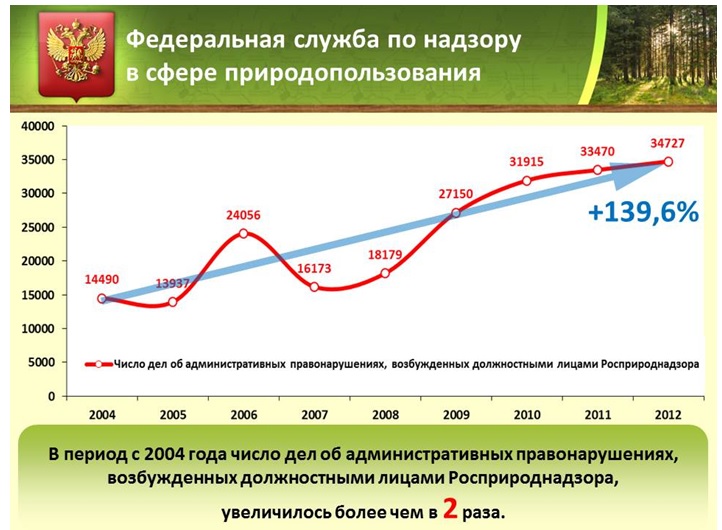 Положительную динамику показывает статистика выявления нарушений в сфере природопользования и охраны окружающей среды – с 2004 года число дел об административных правонарушениях, возбужденных должностными лицами Росприроднадзора, увеличилось более чем в 2 раза.