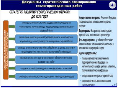 Стратегия развития геологической отрасли Российской Федерации до 2030 года, утвержденная распоряжением Правительства Российской Федерации от 21 июня 2010 г. № 1039-р, наряду с государственной программой Российской Федерации «Воспроизводство и использование природных ресурсов» (подпрограмма «Воспроизводство минерально-сырьевой базы, геологическое изучение недр») являются ключевыми документами стратегического планирования геологоразведочных работ.
