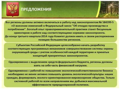 Второе – призываю все регионы к активному включению в работу над законопроектом № 584399-5 «О внесении изменений в Федеральный закон "Об отходах производства и потребления". Ваш богатый опыт правоприменительной практики станет бесценным ориентиром в работе над соответствующими нормами законопроекта. До конца третьего квартала 2014 года Комитет должен обладать всей полнотой информации, иметь в своем распоряжении позицию большинства регионов.