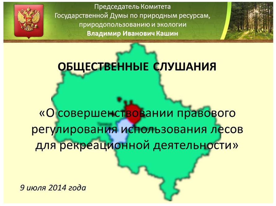 Доклад Председателя Комитета Государственной Думы по природным ресурсам, природопользованию и экологии В.И. Кашина на общественных слушаниях на тему: «О совершенствовании правового регулирования использования лесов для рекреационной деятельности». Московская областная Дума, 9 июля 2014 года.