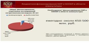 Для стимулирования инноваций в области развития научного обеспечения аквакультуры и мониторинга морских и речных районов необходимо коренное изменение в объеме и направлениях бюджетного финансирования исследований. Предварительные расчеты, по данным науки, показывают, что необходимый ежегодный объем должен составлять около 450-500 млн. руб.