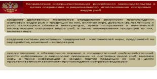 Таким образом, по нашему мнению, необходимо совместными усилиями Минсельхоза России, Росрыболовства и профильных Комитетов Государственной Думы провести большую работу по созданию отдельного законодательного акта, формирующего действенные механизмы определения законности происхождения осетровых видов рыб и продукции из них, универсальную систему контроля продукции из осетровых видов рыб, изготовленной как из дикой, так и выращенной в аквакультуре рыбы, что в свою очередь позволит в полном объеме обеспечить надлежащий контроль за состоянием запасов осетровых и оборотом продукции из них.