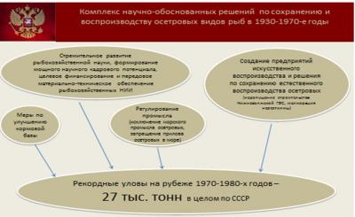 В результате многолетнего, тяжелого труда советских ученых и благодаря совместной работе с государственными производствами того времени добыча осетровых видов рыб достигла максимальных значений за всё советское время именно в конце 1970-х годов и составила 27 тысяч тонн.