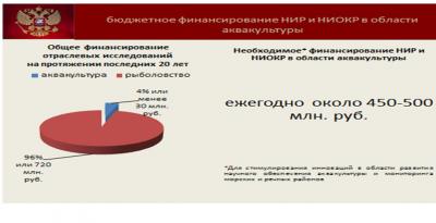 Для стимулирования инноваций в области развития научного обеспечения аквакультуры и мониторинга морских и речных районов необходимо коренное изменение в объеме и направлениях бюджетного финансирования исследований. Предварительные расчеты, по данным науки, показывают, что необходимый ежегодный объем должен составлять около 450-500 млн. руб.