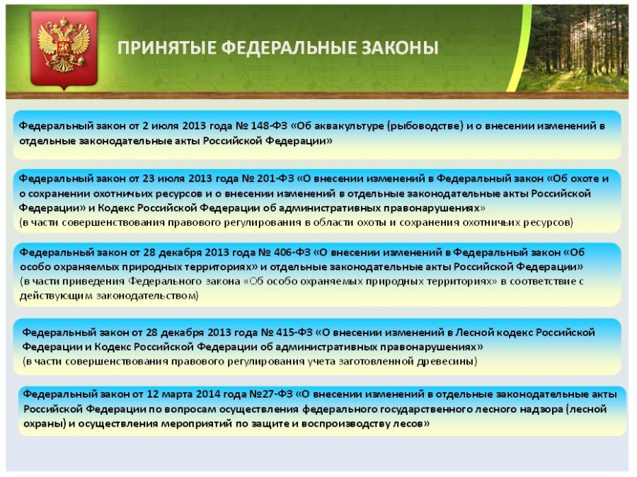 - Федеральный закон от 28 декабря 2013 года № 415-ФЗ «О внесении изменений в Лесной кодекс Российской Федерации и Кодекс Российской Федерации об административных правонарушениях» (в части совершенствования правового регулирования учета заготовленной древесины);